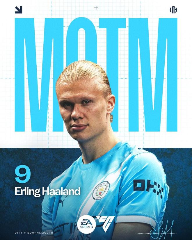 此役主場對陣伯恩茅斯,首發出戰的哈蘭德在比賽第17分鐘和第33分鐘各入一球,上演梅開二度,幫助曼城最終3-1取勝。