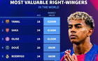 德轉(zhuǎn)列右邊鋒身價(jià)榜:亞馬爾2億歐居首,薩卡第二奧利塞第三